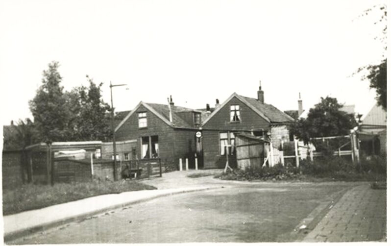 Foto gemaakt vanaf de Klaas Kanstraat bij het Verzetsplantsoen, gezien richting het oostzuidoosten. De twee huisjes centraal in de foto stonden aan het verdwenen Boomgaardspad en droegen nrs. 27-29 en 23-25 (r), beide waren in 1896 gebouwd. De foto werd tegen het einde van de jaren ’50 van de 20e eeuw gemaakt, kort hierna werd de Klaas Kanstraat doorgetrokken en verbonden met de Tuiniersstraat, de huisjes die in het tracé van de weg stonden zijn toen gesloopt. Het linker huisje met nr. 27-29 verdween eind van de jaren ’60 door sloop.
