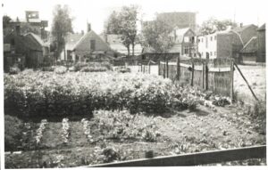 Foto gemaakt vanaf de Klaas Kanstraat bij het Verzetsplantsoen, gezien richting het oostzuidoosten. De twee huisjes centraal in de foto stonden aan het verdwenen Boomgaardspad en droegen nrs. 27-29 en 23-25 (r), beide waren in 1896 gebouwd. De foto werd tegen het einde van de jaren ’50 van de 20e eeuw gemaakt, kort hierna werd de Klaas Kanstraat doorgetrokken en verbonden met de Tuiniersstraat, de huisjes die in het tracé van de weg stonden zijn toen gesloopt. Het linker huisje met nr. 27-29 verdween eind van de jaren ’60 door sloop.