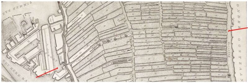 Dit is een kaart uit 1794 gegraveerd door De linker pijl geeft de toegang vanaf de Zaan aan via de Hanenpadsluis tot aan de rechter pijl bij de Watering. Het begin is nog wel hetzelfde. Het is nog steeds mogelijk om vanaf de Zaan de Hanenpadsluis door te gaan, de Hanenpadsloot te bevaren, onder de Wibautstraat door, langs de Boendermaker en zo de Gouw te bereiken. Verder lezen