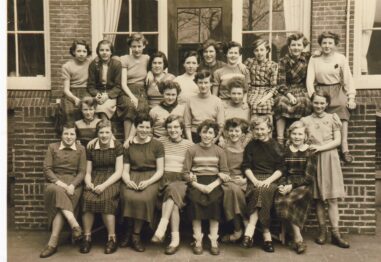 Boven vlnr. Carmen Schut, Lyda Poulain, Guda van Ederen, Meta Peereboom, Gré Geugjes, Irene Tuinman, Beatrix ….., Netty de Haan, Irene Barle Juf Trien Veenis. Midden: Wijnie Langven, Rienke Lenor, Irene de Winter. Voor: Loes Groot, Gré de Boer, Ineke Dill, Anneke Brouwer, Adrie Verheijde, Guda Kuiper, Eef Staal, Hannie Melk.