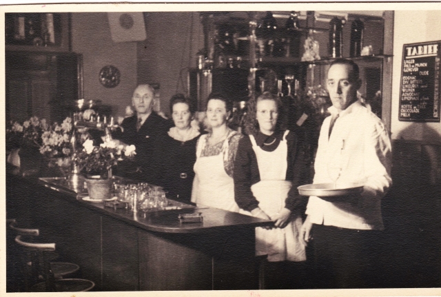 Hier staan ze allemaal achter de bar vlnr: Jan Groot, mevrouw Annie Groot, mevr. Floris, mevr. Schoen en mijn vader.