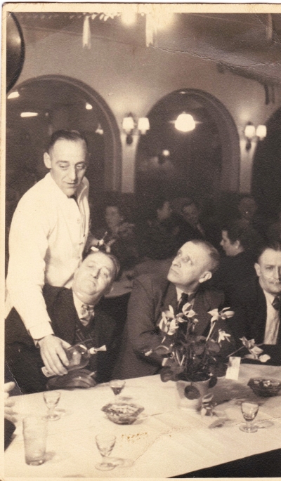 Dit is mijn vader die is er te kelneren. Hij staat achter Rikus Driesten, de manke voddenboer, dan Greven de schilder van de Hogendijk en dan Schermer van de bloemenwinkel op de Zuiddijk bij de kerk.