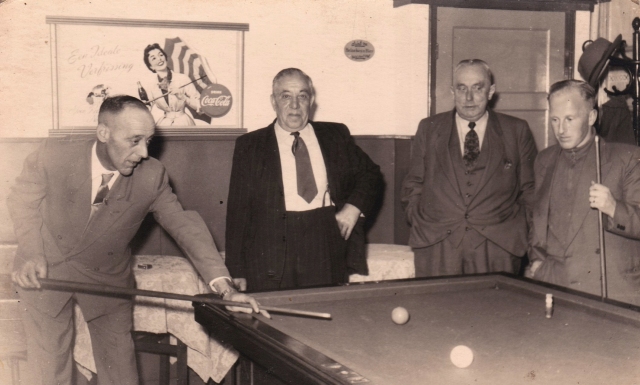 En dit is ook weer in het café van Jan Groot, biljarten. Rechts is de zoon van Jongejans de slager, dan meneer Steens, woonde ook op de Hogendijk. Zijn vrouw had een bakkerswinkeltje maar ze bakte niet zelf. Ze betrok het brood van bakker Pieters van de Jasykoffstraat.
