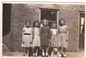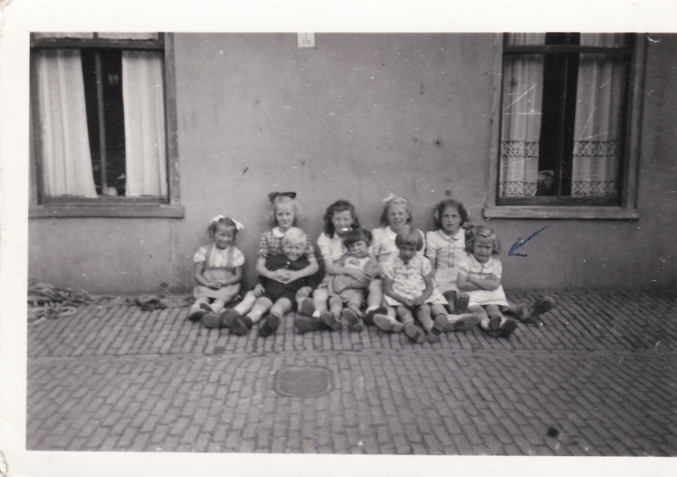 Dit zijn de meiden van onze straat. De eerste is Loes Kesselaar, Geri Bijkerk, Aafje Bos, Janny Nieuwenhuis, 5e Ali Vink, jongetje Dikkie Ooms, dan Emmy Vink, Marrie van Damen en de laatste ben ik.