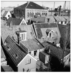 Op de foto kijken we van een pakhuis op de Rozengracht richting Gedempte Gracht en in het grote pand was de school van Eijkman gevestigd.