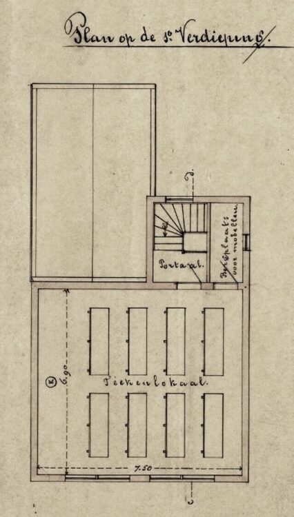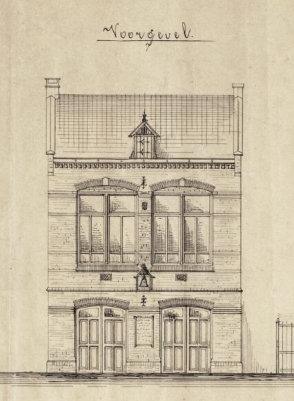 Bij de aanbesteding komt de bouwsom uit op f 5.715,–. Bouwer wordt Jacob Nieuwstad uit Breda. Ontwerp: Gemeentearchitect J. van der Koogh, 1882. Op de 1e verdieping is in het ontwerp al een opstelling gemaakt voor de inrichting van de tekenschool.