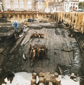 Op deze foto van Wim de Jong van de opgraving van de oude scheepswerf aan de Hogendijk in 1999, zien we een helling met daarop allerlei planken. Makkelijk om op te lopen want dan zak je niet weg in de bagger. Wat je hier ziet liggen zijn stukken van een scheepshuid die ofwel gebroken, beschadigd en om wat voor reden niet meer gebruikt kunnen worden om als scheepshuid te dienen die nu als ondergrond zeer geschikt zijn.