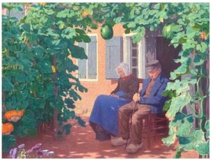 Het schilderij in het museum Singer Laren geeft nog eens een ludiek beeld van een Larens boertje die aan het werk is geweest en even een middagdutje doet. Hier afgebeeld naast zijn vrouw met z’n klompen aan.